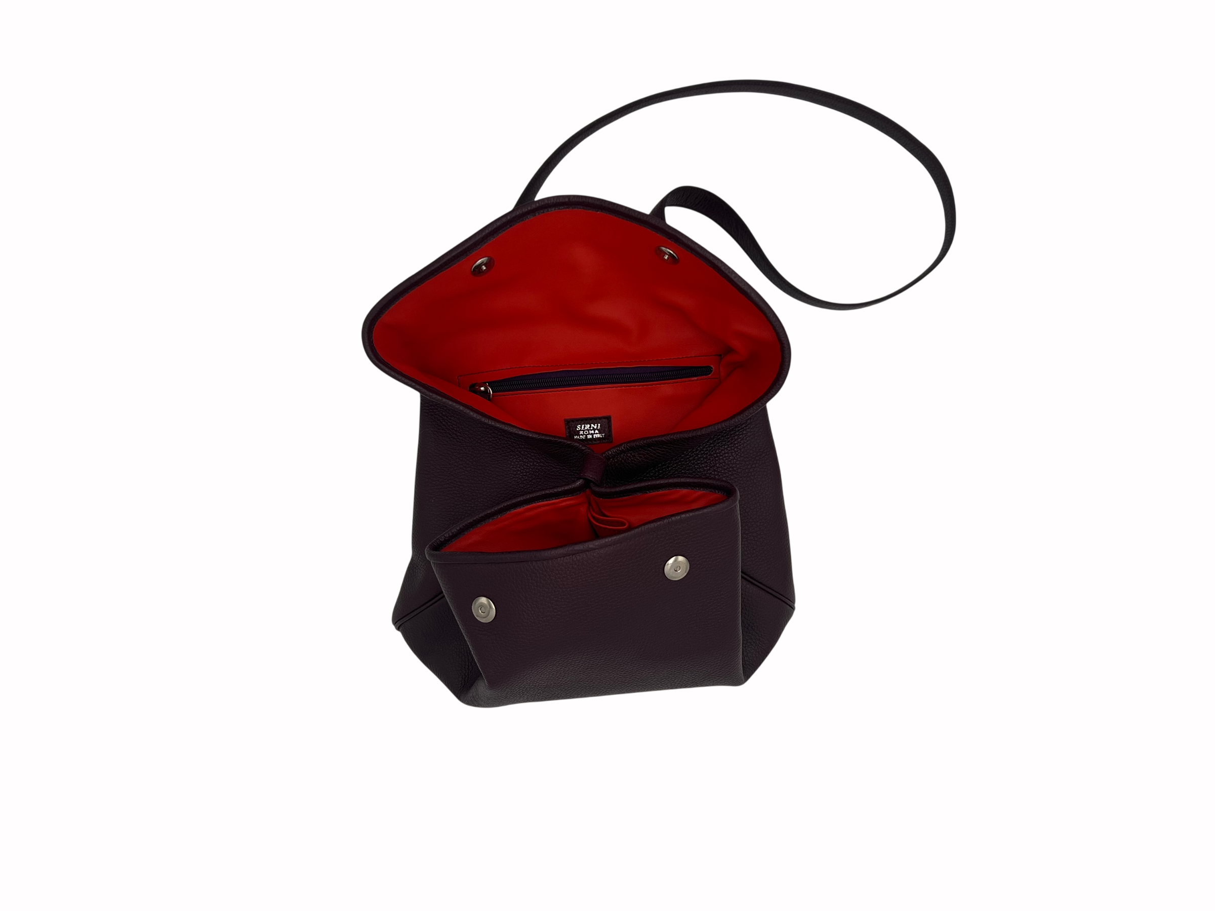 L’interno è organizzato in due scomparti divisi da un bottone, completati da una pratica tasca con zip. La chiusura con doppia calamita assicura praticità e protezione in ogni momento.