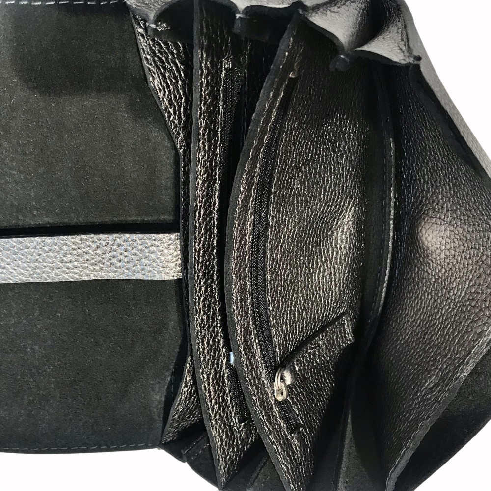 Piccolo marsupio con tre scomparti, due tasche con zip interne e altre due tasche senza zip.